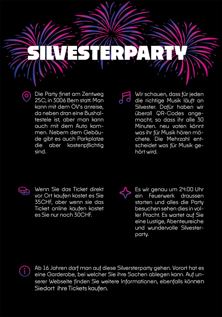 Im Rahmen eines fiktiven Auftrags entwickelte ich ein Gestaltungskonzept für eine Silvesterparty. Ziel war es, einen Flyer zu erstellen, der potenzielle Gäste informiert und gleichzeitig visuell aufmerksam macht. Dabei lag der Fokus auf einer klaren Informationsstruktur sowie einer auffälligen, zur Veranstaltung passenden Gestaltung. Der Flyer wurde mit Adobe Illustrator gestaltet und in Adobe InDesign final umgesetzt.
